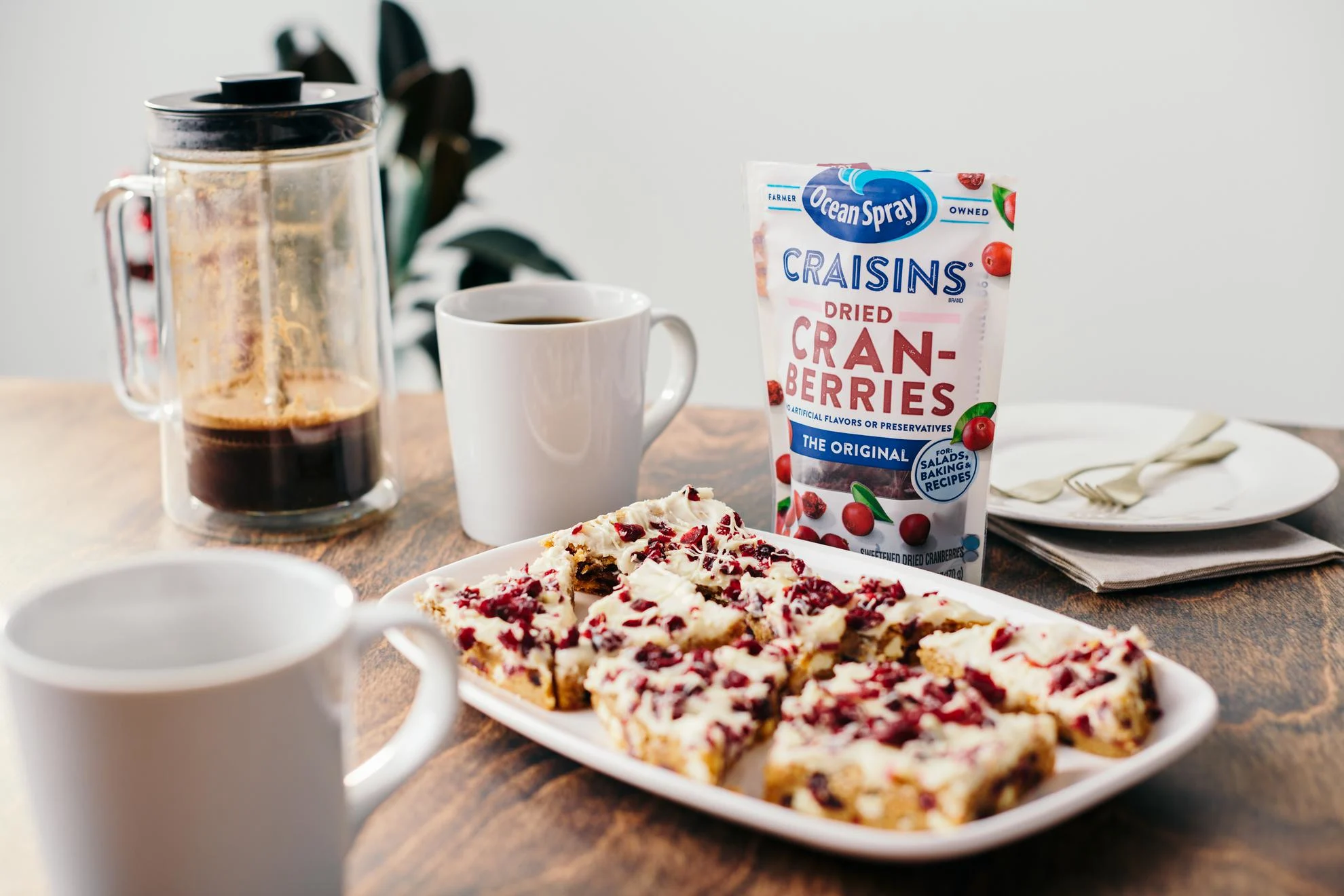 For the frosting, beat the cream cheese, powdered sugar, butter, and vanilla extract together until smooth and creamy. Add the milk and mix until combined. Spread the frosting evenly over the cooled bars. Sprinkle the chopped dried cranberries on top.
