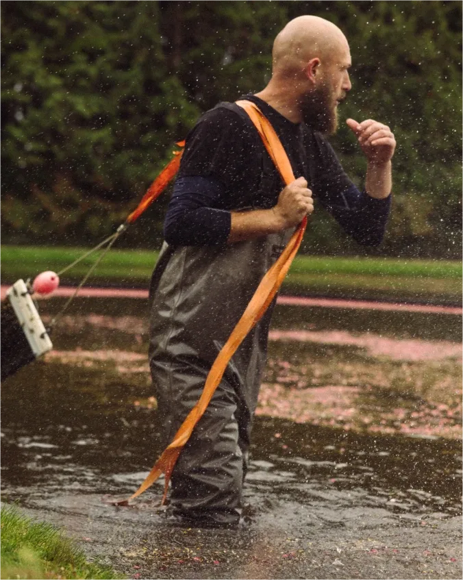 A farmer stands in a flooded cranberry bog with a tractor in the distance.