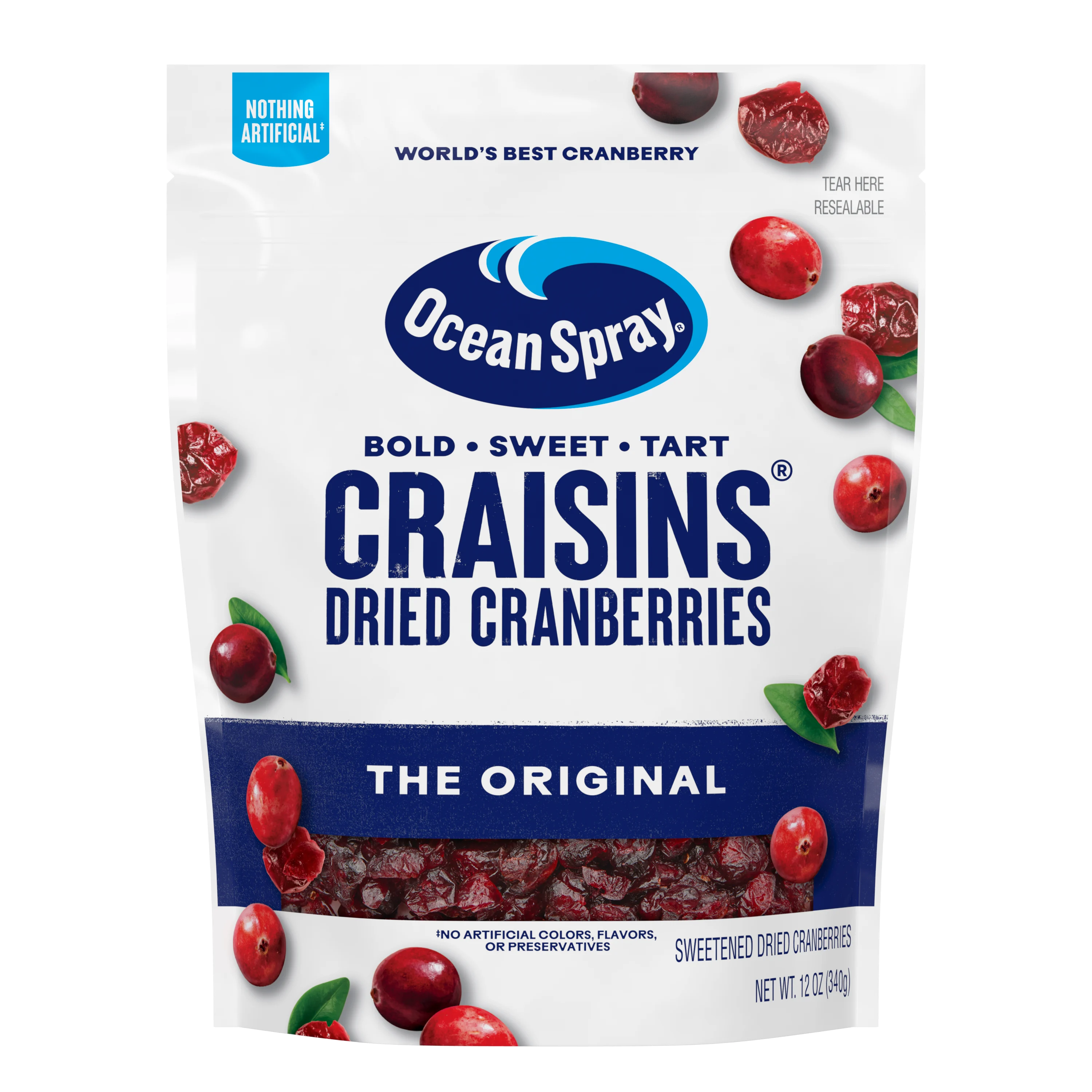 The original. The legend. Ocean Spray® Craisins® Original Dried Cranberries. Mouth-watering flavor with uncanny nutrition. This cranberry dried fruit product is an easy way to work in 25% of your daily recommended fruit needs. No artificial flavors or preservatives. Enjoy real, bold dried cranberries in every dried fruit pouch. Potent little puckers that are peanut-free, gluten-free and judgment-free. Top your weeknight salads. Mix them in your oatmeal or cereal. Use as baking ingredients in your favorite treats, like chewy dried cranberry oatmeal chocolate chunk cookies. Step up your entertaining game by adding their powerful flavor and color to apps, charcuterie boards and more. Transform boring lunches and dinners into mic-dropping meals - from chicken salad and gourmet grilled cheeses to Crockpot curry, beef stew and even Taco Tuesdays. It's true. They're surprisingly delicious on tacos and in guacamole. Can raisins do all that? Nope. They're also just really good on their own.