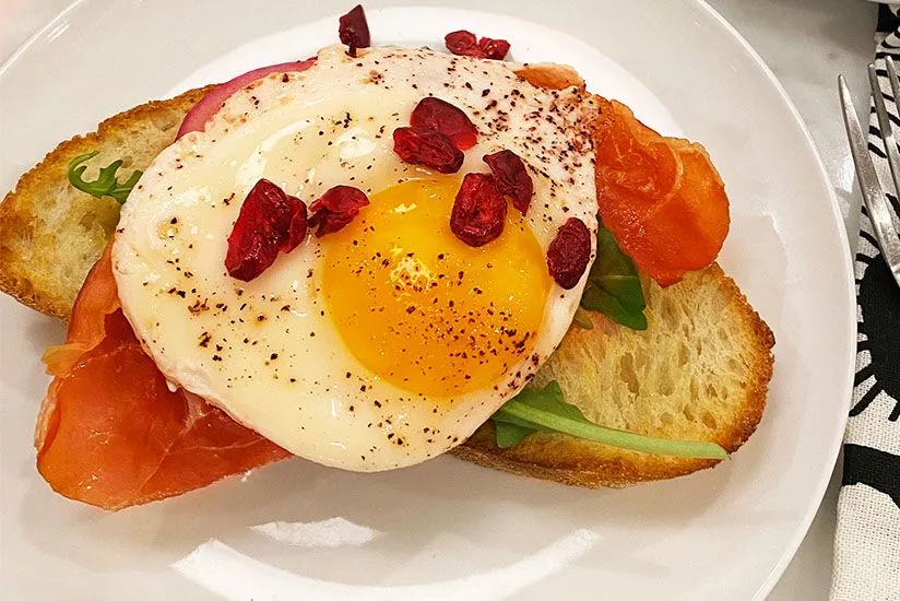 Heat oven to 375° F. On a parchment-lined, rimmed baking sheet, arrange the ham. Bake until crisped and lightly browned; about 10 minutes. Transfer to a wire rack to let cool. Heat a cast-iron skillet over medium-high. Add the oil and the onion; season with salt. Cook until lightly browned and wilted; 2 to 3 minutes per side. Transfer to a plate. Add the tomato slices and cook until browned in spots and the skin has wilted; about 2 minutes per side. Transfer to the plate with the onions and season both with pepper. Using tongs and a paper towel, wipe out the skillet, add the butter and fry the eggs to your liking. Remove to a plate once cooked. Season with salt and pepper. While the eggs cook, toast or grill the bread on both sides. When still warm, but cool enough to handle, rub the bread with the garlic slices to “grate” the garlic onto the bread. Drizzle with olive oil and season with salt and pepper. Set aside. Top each slice of toast with some arugula leaves, some of the tomato and onion, a tablespoon of Craisins® Dried Cranberries, the crisped ham, and an egg. Serve immediately.
