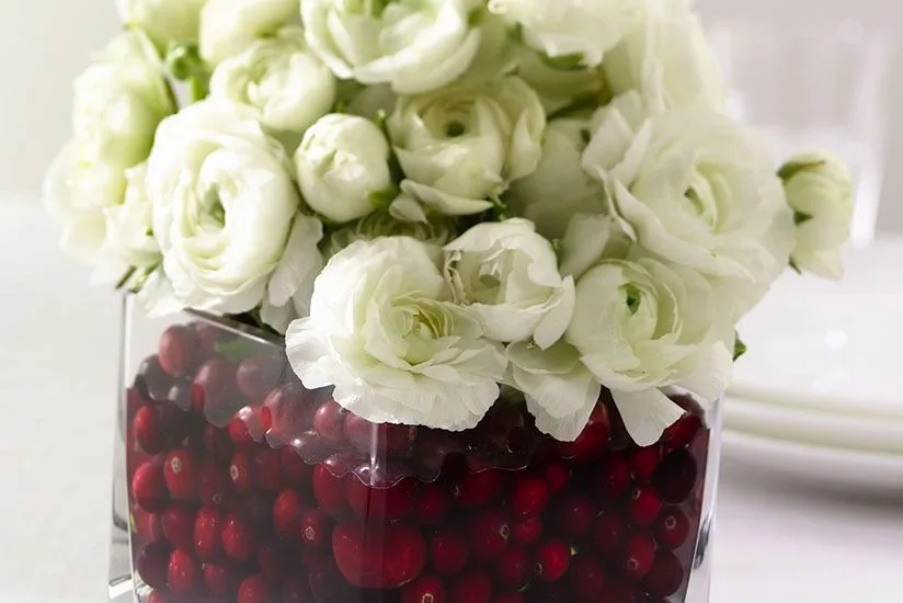 Start with an empty vase or pitcher. Add 1 or 2 bags of Ocean Spray® Fresh Cranberries (depending on the size of the vase) and enough water to fill vase 3/4 full. Using a sharp knife, carefully cut the ends off the fresh flowers at a 45-degree angle. Add cut flowers to vase, arranging as needed. Replace water daily or as needed, and discard berries when they become soft, which can range from a few days to about a week.