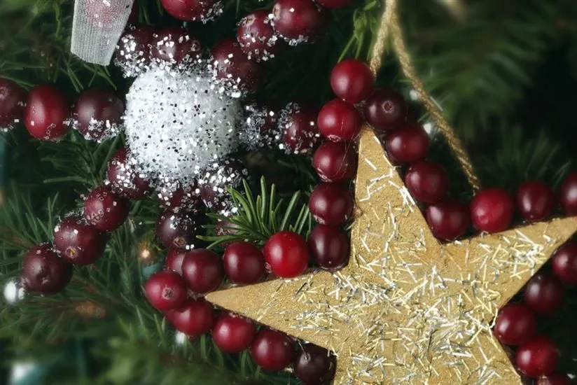 Directions: Cut two 5” pieces and one 6” piece of wire. Push the pieces of wire through the foam ball, forming the spokes in a snowflake shape. Start by stringing cranberries onto the longer spoke of wire, leaving 1 1/4” at the end. Bend top wire into a simple hook for hanging. Continue stringing cranberries onto each spoke, leaving 1/4” free at the end. Using a hot glue gun, attach a metallic craft bead to the end of each wire spoke to secure berries in place. Apply thin layer of craft glue to foam ball and sprinkle with metallic glitter. Let dry. Tie decorative ribbon at top of snowflake and hang with hook.