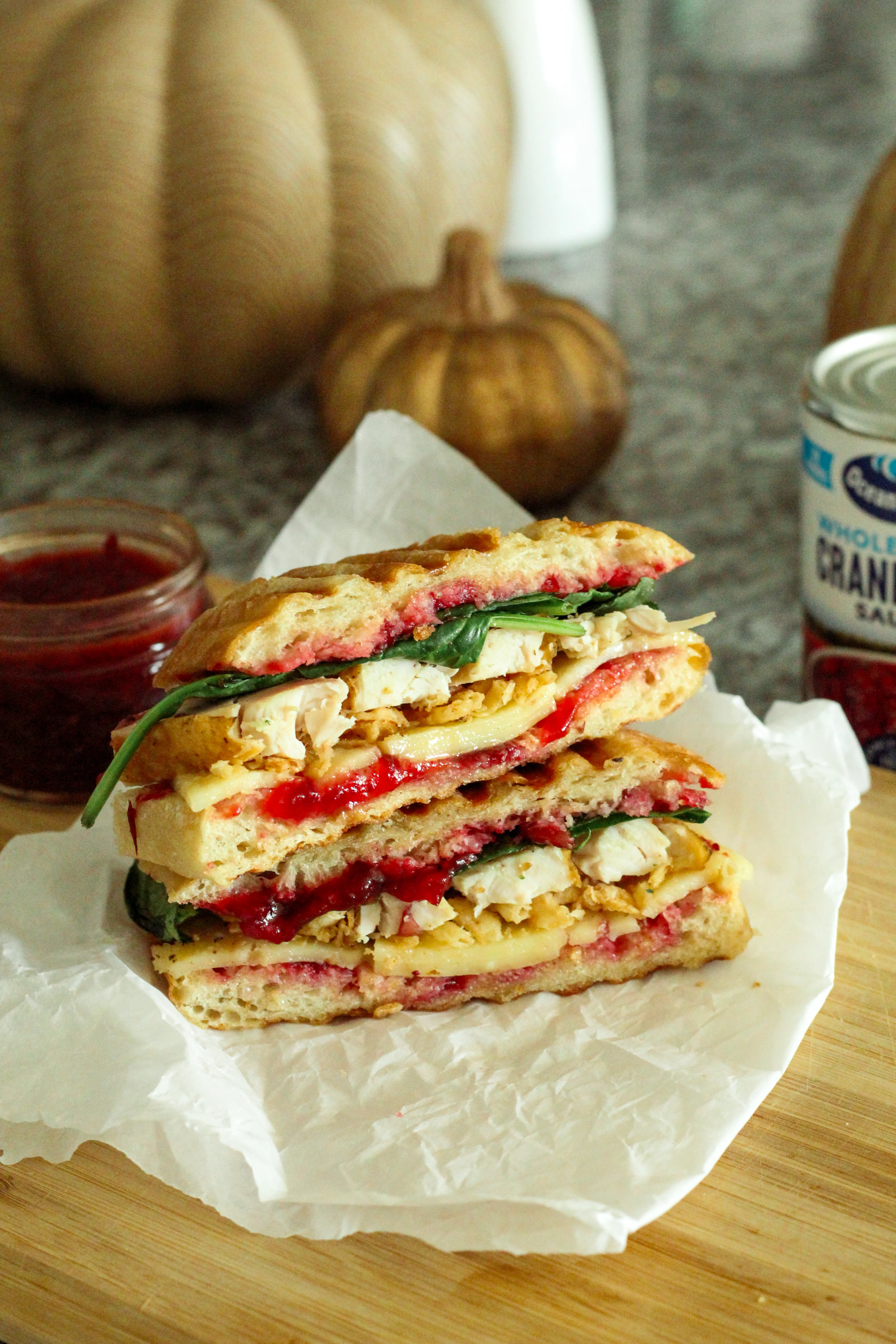 Spread cut sides of roll (or one side of each slice of bread) with RedHot® Cranberry Sauce mixture. Place 1/4 cup spinach, French’s® Crispy Fried Onions, 4 ounces of turkey and a slice of cheese on bottom half of roll. Place the top half of the roll back on top and press slightly together. Brush top and bottom of sandwich with olive oil.